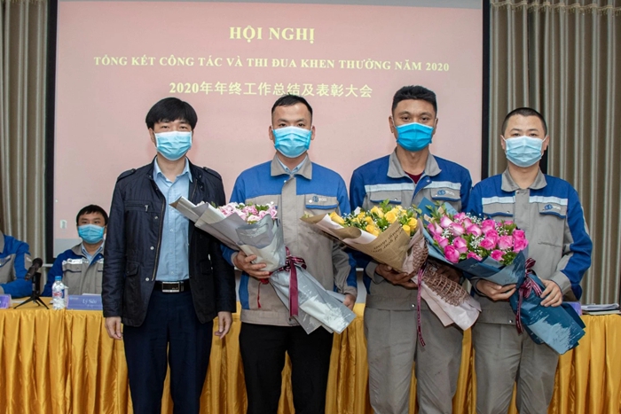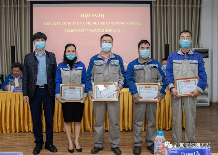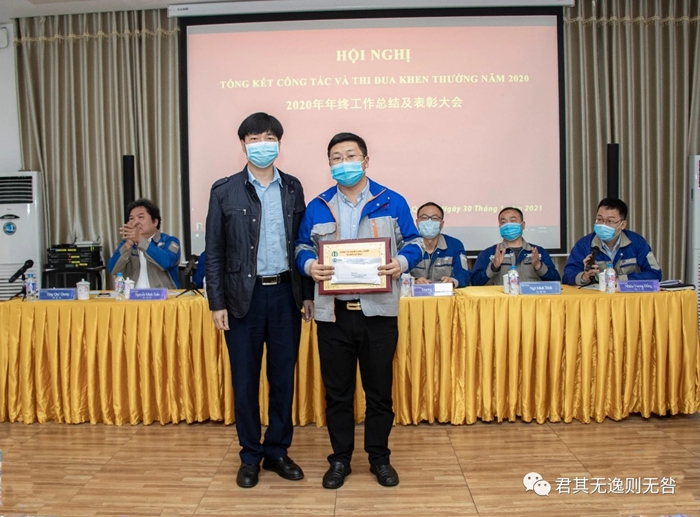 祿文朝、楊磊、阮維松被集團公司授予優(yōu)秀員工,公司董事長柯良鋒代表集團公司頒發(fā)表彰。