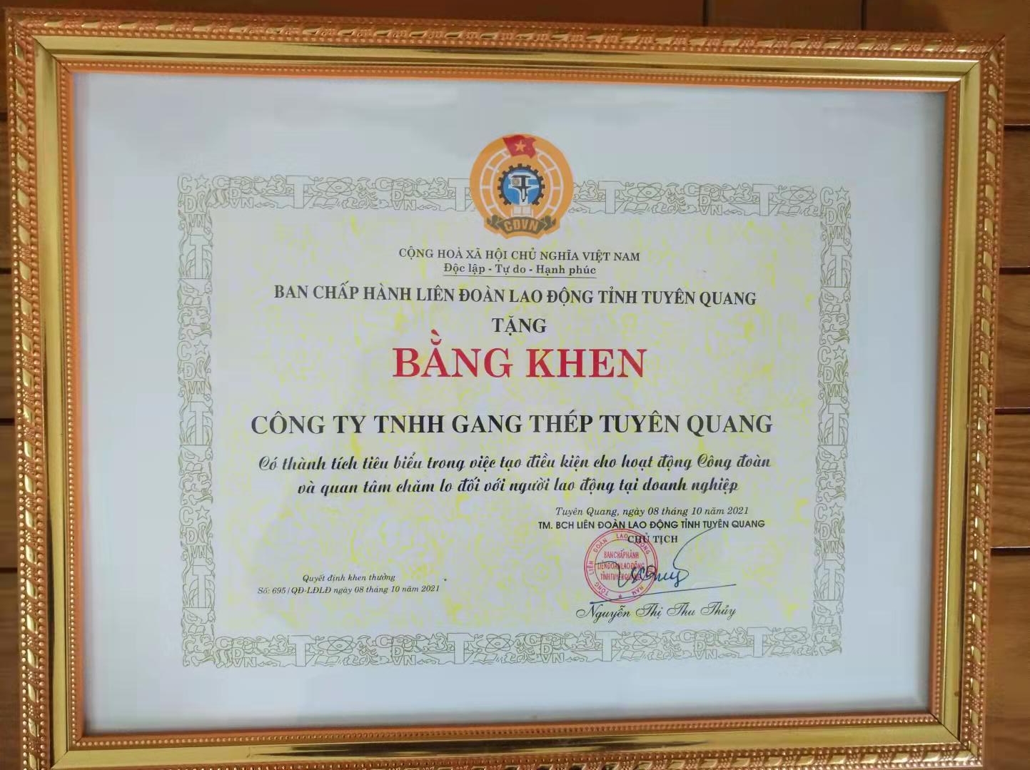 越南宣光省政府頒發(fā)的省長(zhǎng)獎(jiǎng)狀一,旨在獎(jiǎng)勵(lì)宣光鋼鐵有限責(zé)任公司在宣光?。?020年—2021年)企業(yè)活動(dòng)中取得優(yōu)異成績(jī);越南宣光省政府頒發(fā)的省長(zhǎng)獎(jiǎng)狀二,旨在獎(jiǎng)勵(lì)宣光鋼鐵有限責(zé)任公司在宣光省2016年—2021年度的社會(huì)建設(shè)學(xué)習(xí)、勸學(xué)、助才競(jìng)賽活動(dòng)中成績(jī)優(yōu)異。前兩份獎(jiǎng)狀均由越南宣光省省長(zhǎng)阮文山簽字。越南宣光省勞動(dòng)聯(lián)合執(zhí)委會(huì)頒發(fā)的獎(jiǎng)狀三,旨在獎(jiǎng)勵(lì)宣光鋼鐵有限責(zé)任公司為工會(huì)創(chuàng)造活動(dòng)條件,關(guān)心、照顧勞動(dòng)者上成績(jī)突出。該獎(jiǎng)狀由宣光省勞動(dòng)聯(lián)合執(zhí)委會(huì)主席阮秋水簽字。? ? ??