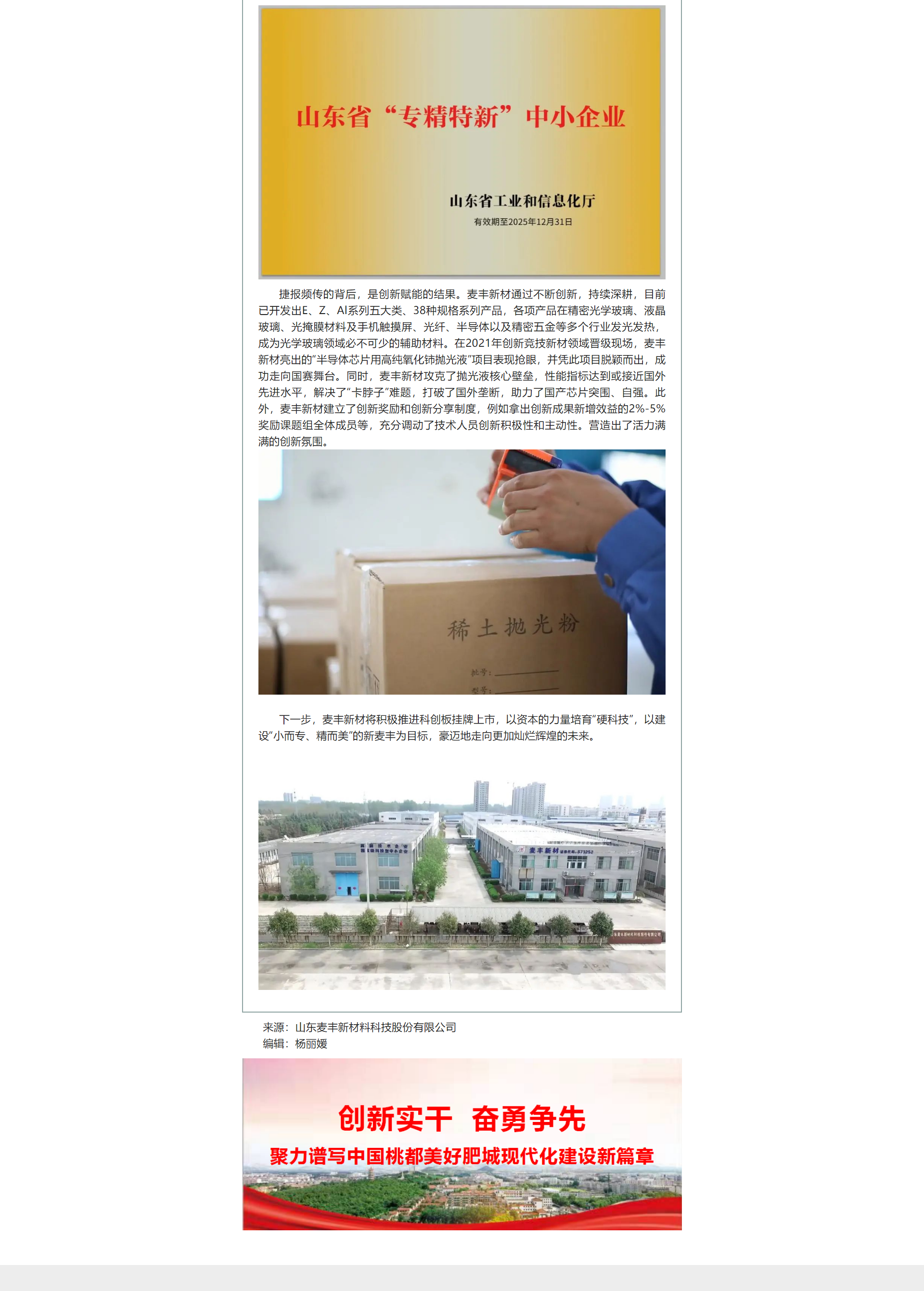 肥城高新公眾號刊發(fā)《山東麥豐新材料科技股份有限公司"瞪羚企業(yè)"培育“硬科技”,建設“小而專、精而美”,激發(fā)高質量發(fā)展新動能》文章